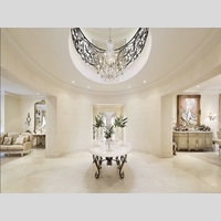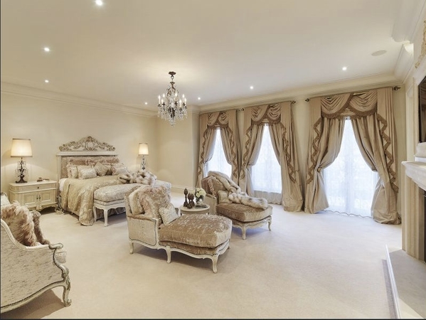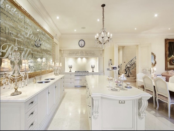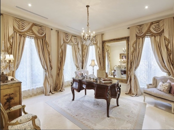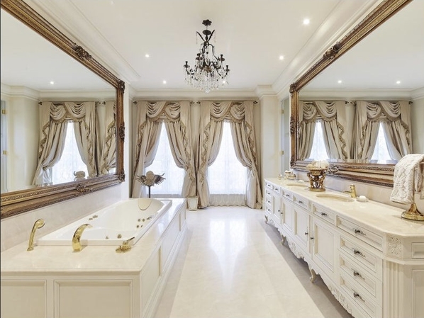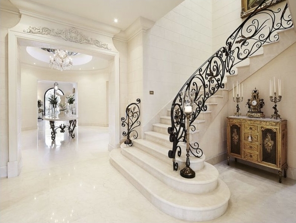 The central chandelier in the main entrance foyer was manufactured locally and was assembled on site and then winched into it final position. The cast iron wall lights on either side of the front door were also made by the same craftsmen. All of the other chandeliers and ornate wall lights were individually selected by the owner and imported from France and Italy.
