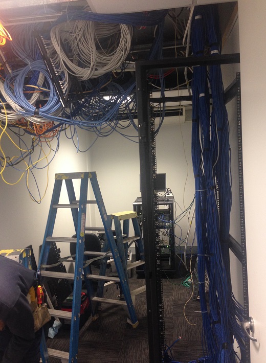 Everything had to be replaced and the cabinets needed to be dismantled and removed so the carpet could be professionally dried. The only way this could be done was to suspend the patch panels from the ceiling grid so the cleaners could get into the room. While arrangements were made for some staff to work from home we still had to keep the 24/7 call centre on the 9th floor operational. This meant that we had to keep the incoming phone lines, internet and connection to their servers operational during the fix up.
